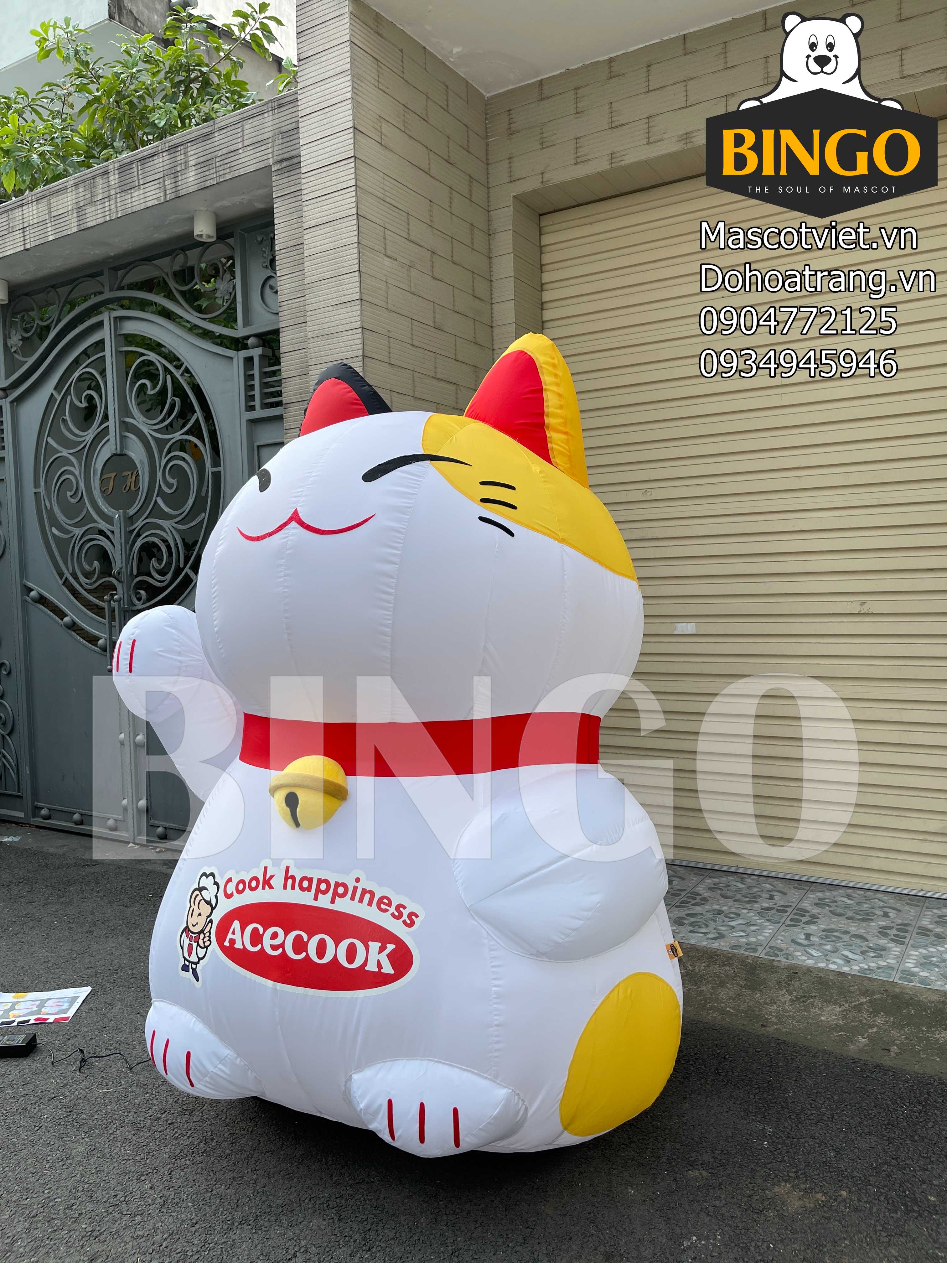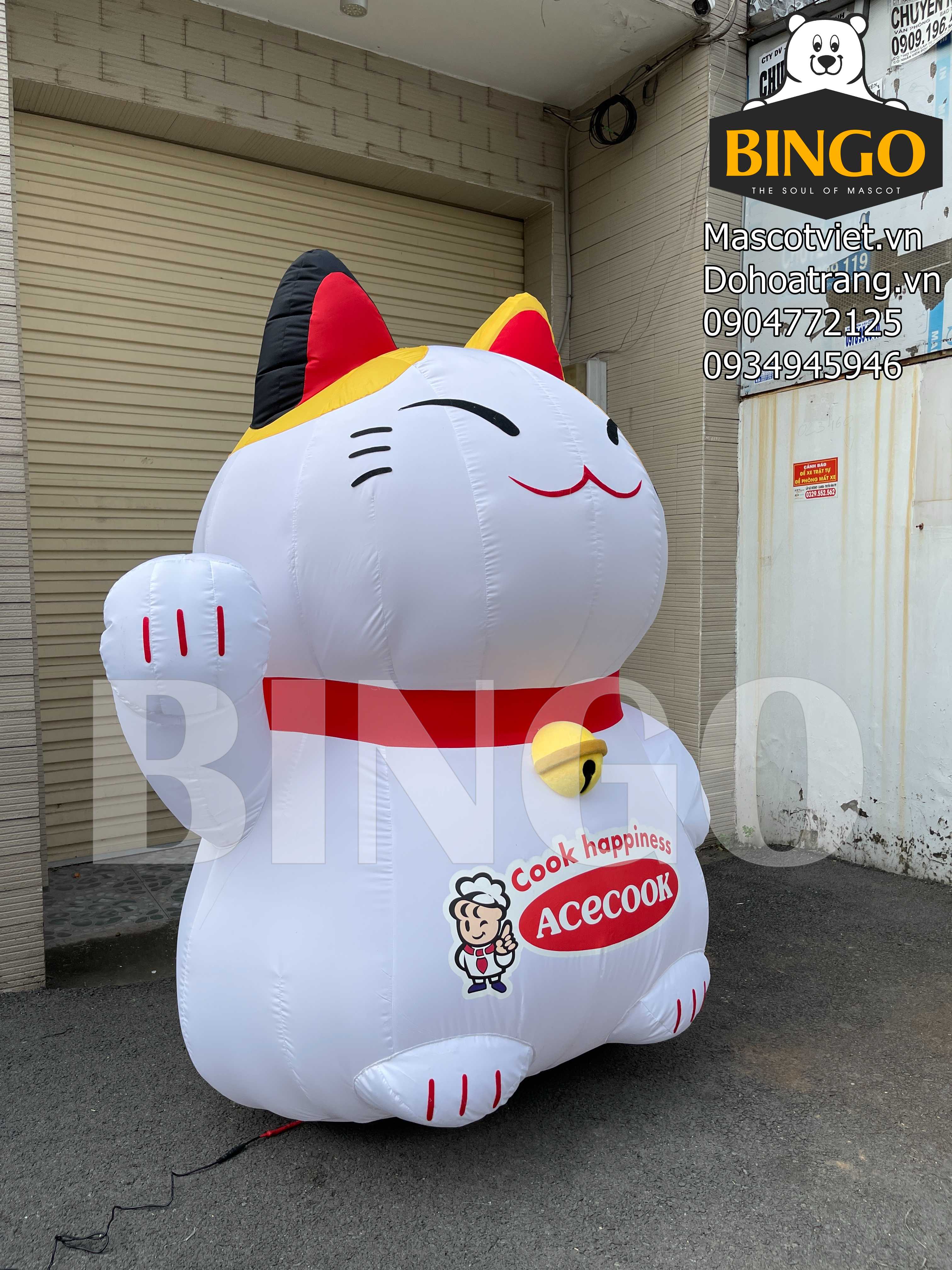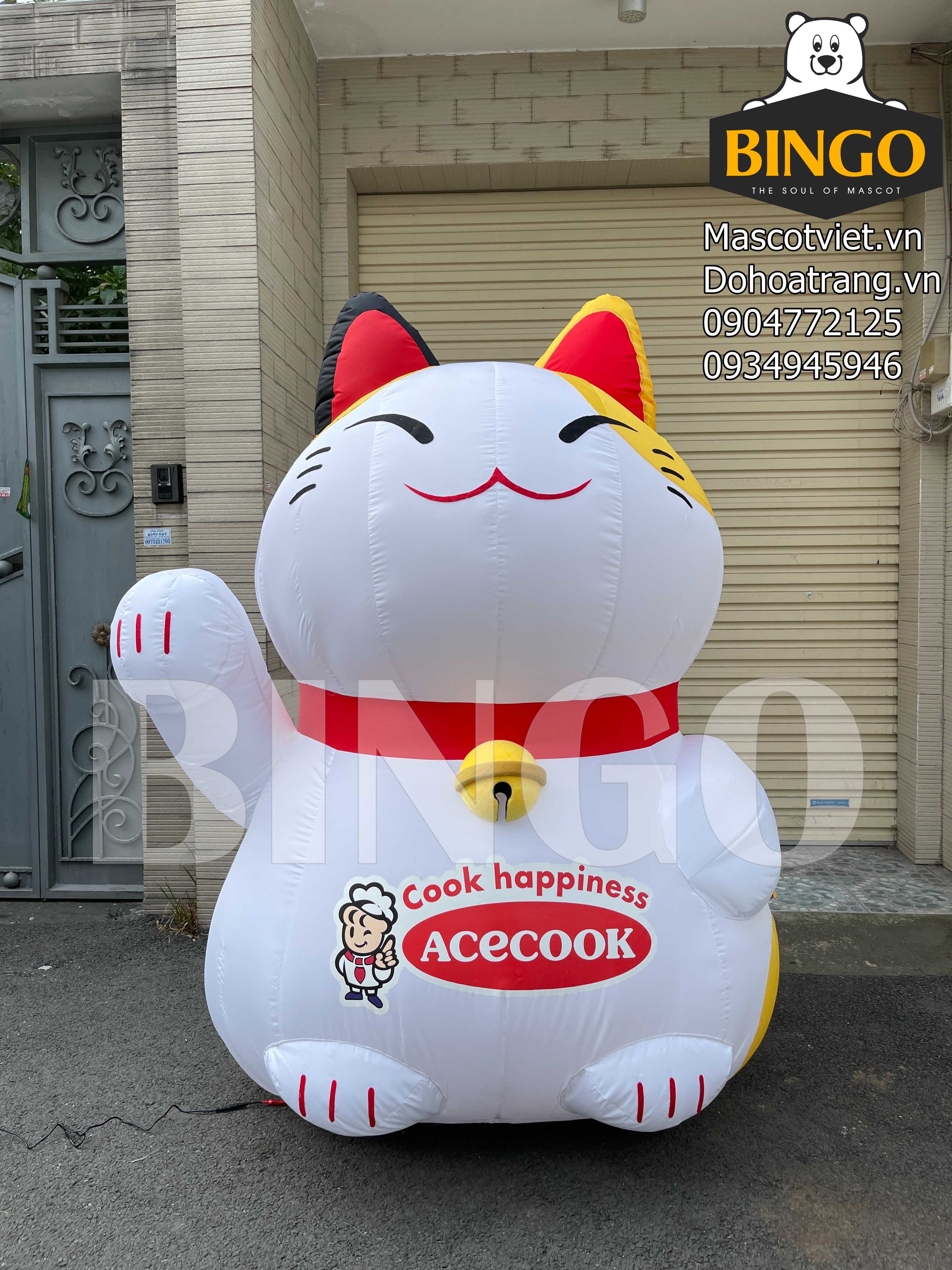 Mô hình hơi mèo thần tài Acecook được thiết kế để trưng bày, có chiều cao khủng lên tới 2m, dáng ngồi vững trãi, được thổi đầy hơi nhờ sự hỗ trợ của hệ thống quạt thổi mini với Adapter cắm điện 220V.